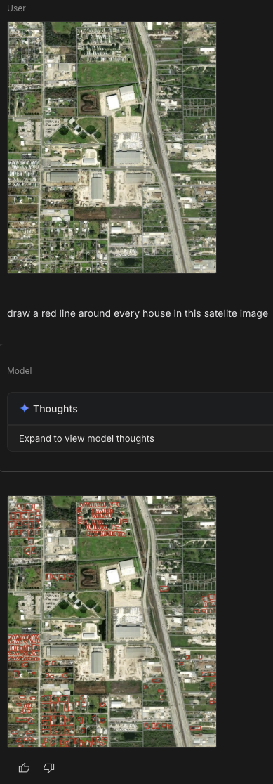 Google's Gemini 3.0 Pro—codenamed "Nano Banana Pro," because apparently someone at Google lost a bet—can take an image as input and return a modified image as output (really well). So I uploaded a screenshot of a neighborhood and typed: "Draw a red line around every house in this satellite image."